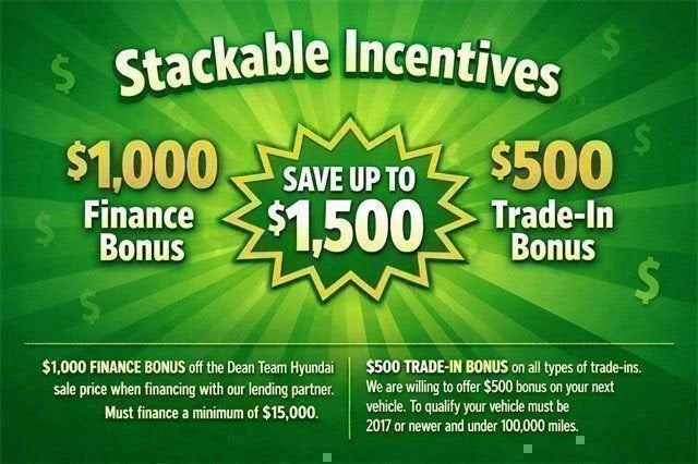 $1,000 FINANCE BONUS off the Dean Team Hyundai sales price when financing with our lending partner. Must finance a minimum of $15,000.